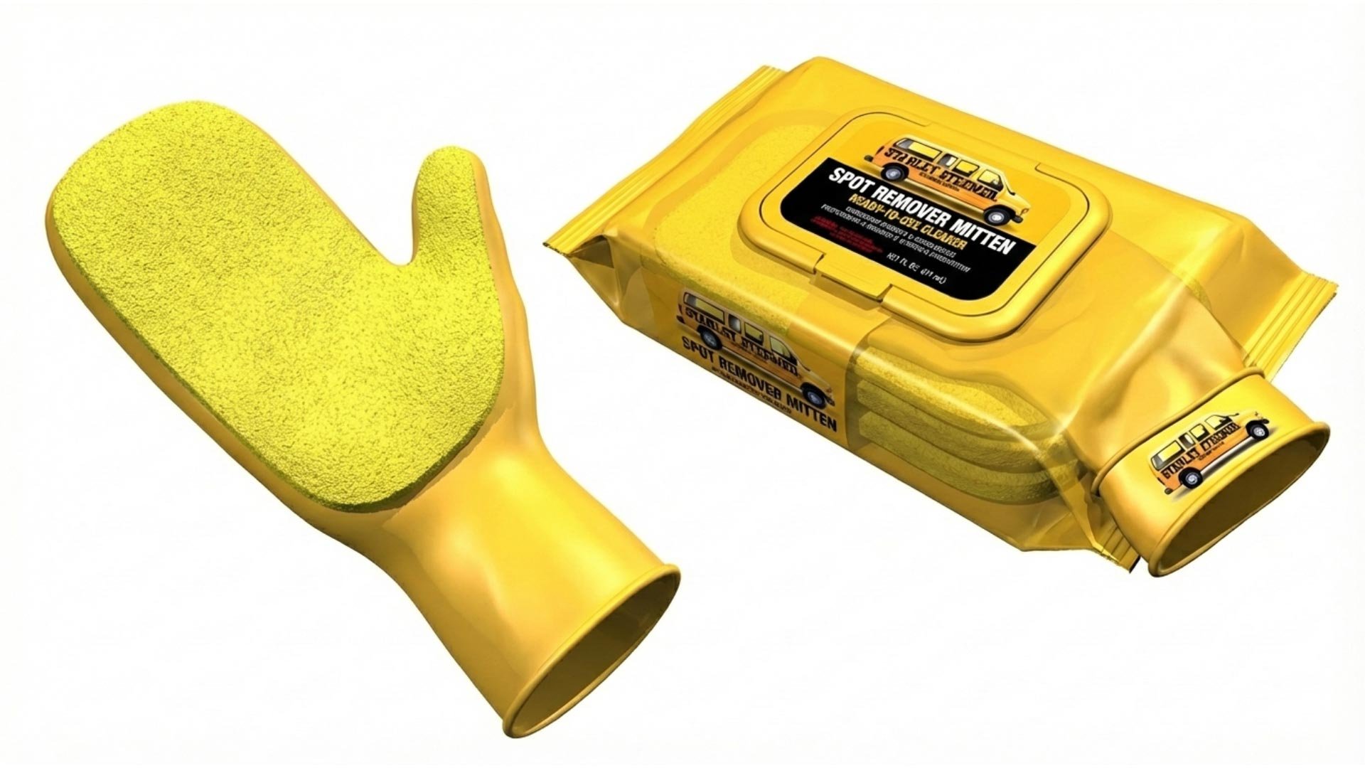 I developed two distinct product concepts: a handheld pretreated sponge system with replaceable, disposable sponge heads, and a retail-packaged latex glove solution in which each glove featured a palm-embedded sponge pre-loaded with stain-removing solution. The gloves were designed to invert on removal, keeping the soiled sponge contained for hygienic disposal.